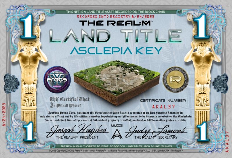 Select and purchase Your Agricultural Large Land Plot for staking out your prime properties in the (Medical Isle). The Land Title on the Blockchain secures your land for potential Doctor / Educational / Wellness Facilities and Universities, plus with this property ownership comes new advances in technology in parts of the island. Receive your NFT on the Blockchain on Asclepia Key in The Realm when you purchase your Land Title.