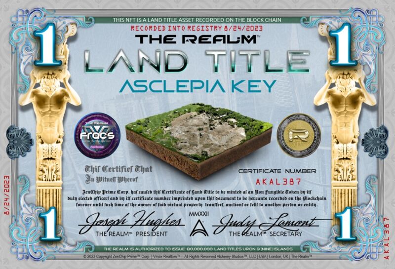 Select and purchase Your Agricultural Large Land Plot for staking out your prime properties in the (Medical Isle). The Land Title on the Blockchain secures your land for potential Doctor / Educational / Wellness Facilities and Universities, plus with this property ownership comes new advances in technology in parts of the island. Receive your NFT on the Blockchain on Asclepia Key in The Realm when you purchase your Land Title.