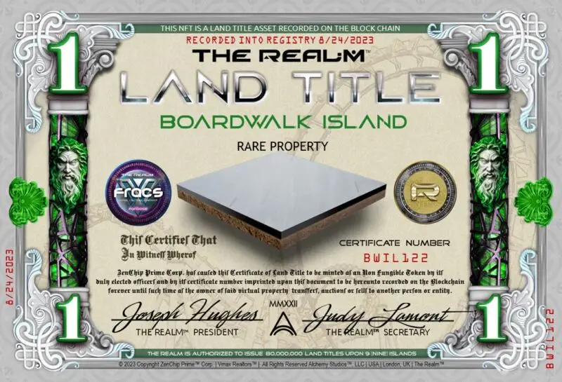 Immerse in a colossal theme park fusing Sea World, Universal Studios, Busch Gardens, and Disneyland’s charm. From thrilling coasters on cliff-sides to vibrant events at the coastal stadium, it’s the pinnacle of family fun. Secure a Blockchain-verified Boardwalk Commercial Large Land Title, anchoring your place in this entertainment paradise. Every purchase rewards a unique FRAC from Alchemy Studios, making you an art owner and a key player in shaping The Realmâ„¢. Stake your claim today!