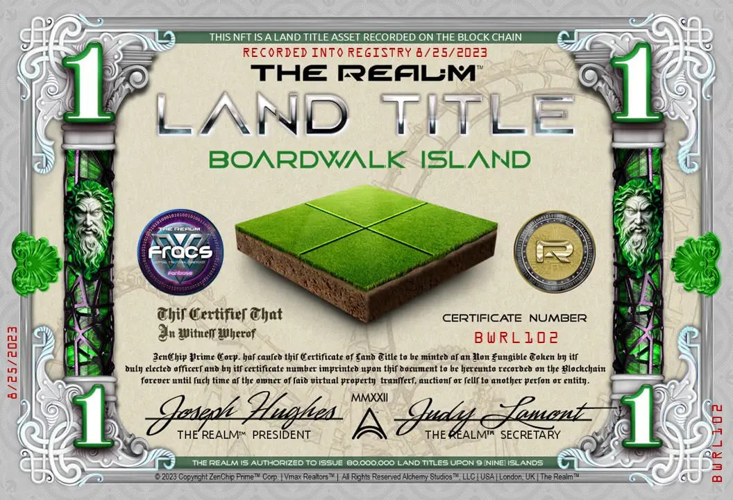 Immerse in a colossal theme park fusing Sea World, Universal Studios, Busch Gardens, and Disneyland’s charm. From thrilling coasters on cliff-sides to vibrant events at the coastal stadium, it’s the pinnacle of family fun. Secure a Blockchain-verified Boardwalk Commercial Large Land Title, anchoring your place in this entertainment paradise. Every purchase rewards a unique FRAC from Alchemy Studios, making you an art owner and a key player in shaping The Realmâ„¢. Stake your claim today!