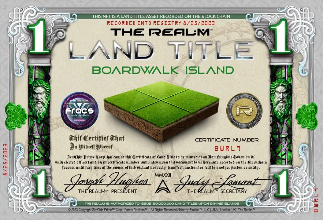 Immerse in a colossal theme park fusing Sea World, Universal Studios, Busch Gardens, and Disneyland’s charm. From thrilling coasters on cliff-sides to vibrant events at the coastal stadium, it’s the pinnacle of family fun. Secure a Blockchain-verified Boardwalk Commercial Large Land Title, anchoring your place in this entertainment paradise. Every purchase rewards a unique FRAC from Alchemy Studios, making you an art owner and a key player in shaping The Realmâ„¢. Stake your claim today!
